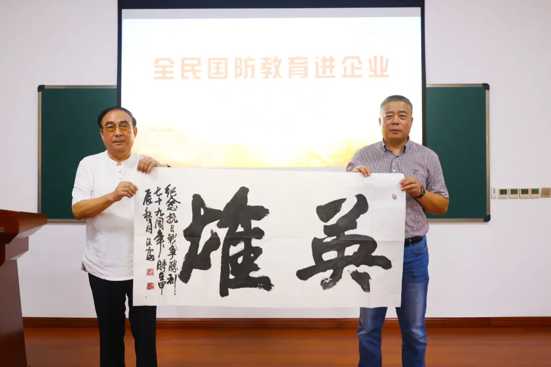 龙口市全民国防教育宣讲员、国防教育师资库成员张建鲁现场宣讲抗战精神,普及全民国防教育知识。最美退役军人杨德富现场赠送书法作品《英雄》,“好博一定要充分利用好这一生动教材,讲好英雄故事,传承红色基因,让革命薪火代代相传。”最后,大家共同观看了龙口市第一部抗战题材电影《战火中的雕像》,从影片中感受了抗日英雄任常伦的英勇事迹。
