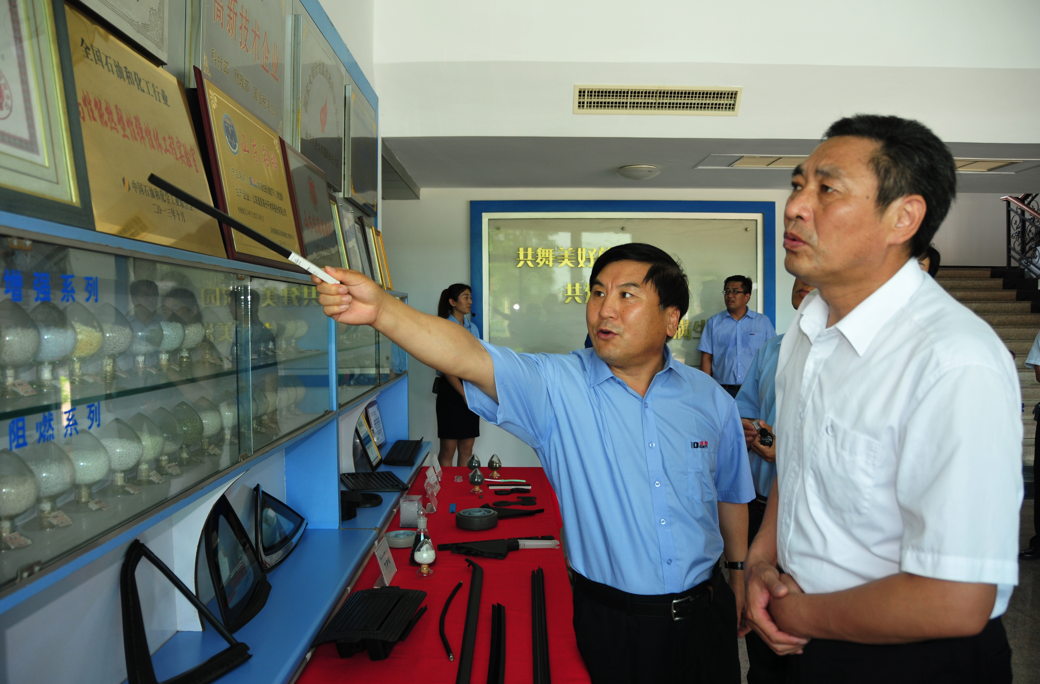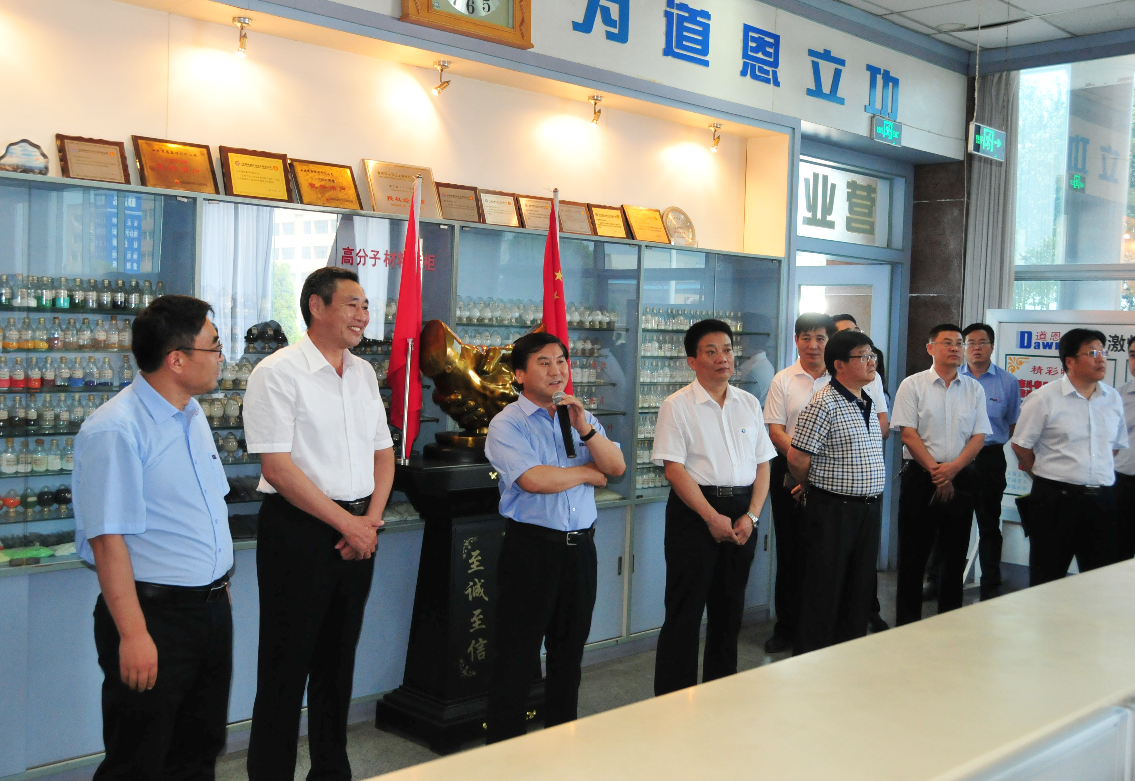 集团公司董事长、总裁于晓宁陪同陈家忠董事长一行参观了好博营销中心、物流公司、航运公司、润禾公司、好博湖公园、钛业公司、高材公司。随后,在高材公司二楼会议室举行了座谈会。于晓宁总裁首先对客人的来访表示热烈欢迎,他说好博与龙矿地缘相近、人缘相亲,有着密不可分的缘分,希望双方充分沟通交流,深化各个业务领域的合作,既要强强联合,又要优势互补。集团公司常务副总裁索延辉就企业文化理念、管理模式、团队建设、战略规划、管控网络、创新平台、科技奖励等方面做了情况介绍。