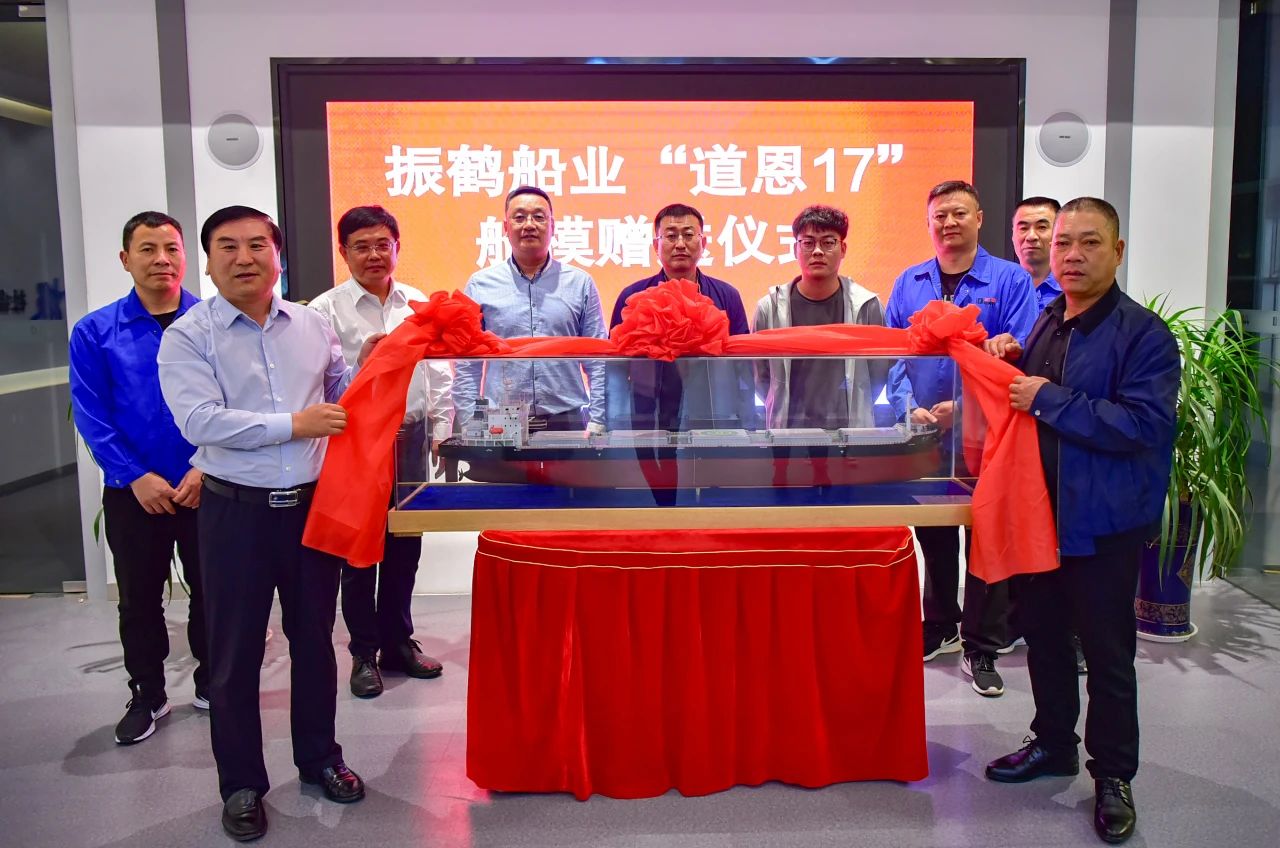10月8日,宁波振鹤船业公司向好博集团赠送“好博17”轮船模仪式在好博集团总部举行,龙口市副市长赵树杰,宁波振鹤船业公司董事长严星聪,好博集团董事长于晓宁、副总裁宋慧东、分管领导解总、好博国际物流公司总经理韩永卫出席活动。