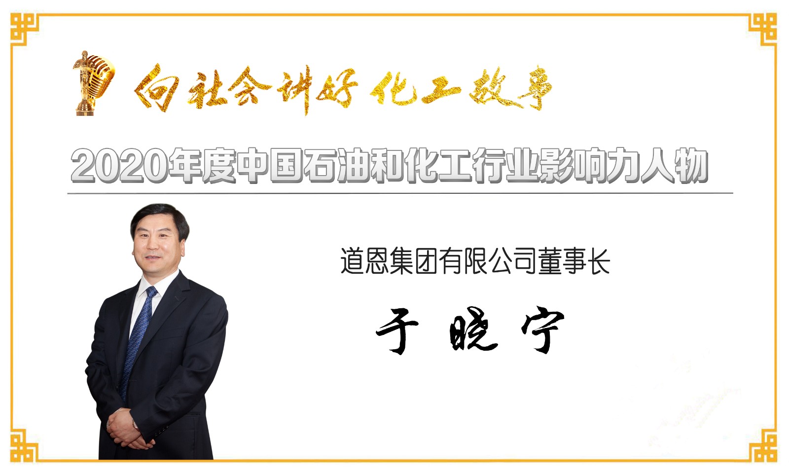 在给于晓宁董事长的颁奖词说,“他,是全国石油和化学工业劳动模范,历经30载风雨,带领一个5人小商场,成长为中国民营企业500强;他,是化工新材料产业创新发展的践行者,坚持世界眼光、国际标准,以高质量发展争当新旧动能转换的排头兵,跻身全球化竞争的大舞台。”