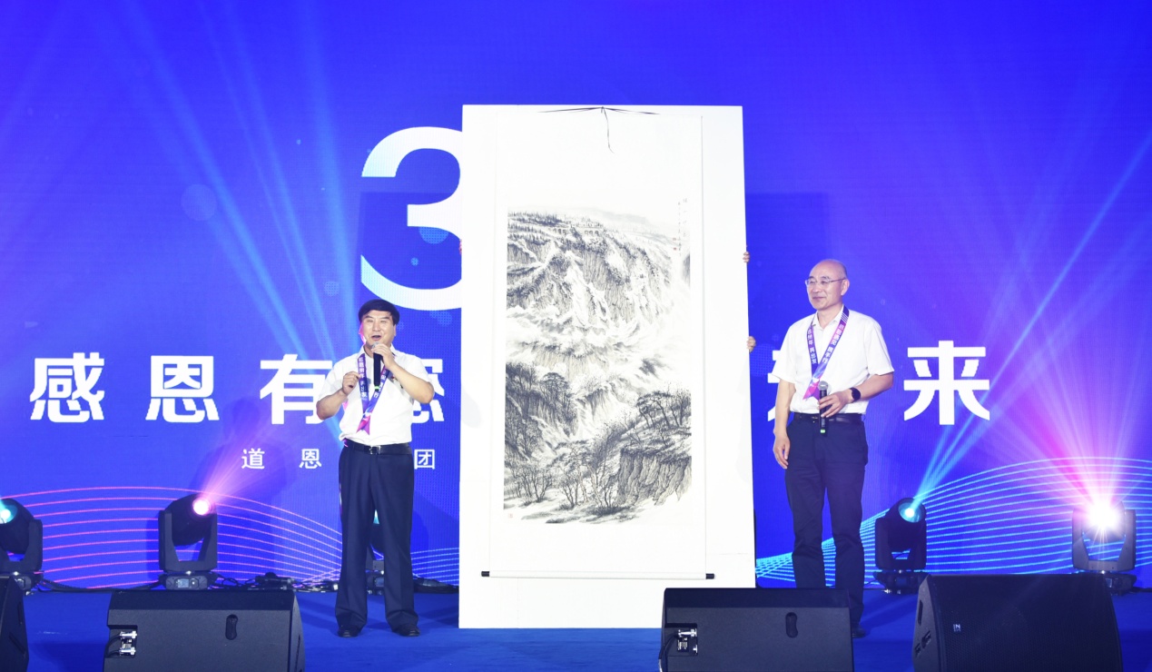 随后,主持人宣读了中石油、中石化等国内知名客户以及浙江大学等高校发来的贺电与贺信。在活动现场,青岛科技大学校长陈克正带来了一份特殊的礼物——《骊山印象》图。“从画中可以看到,山气势磅礴,层峦叠嶂,高耸入云,林木遍野;寓意着好博背靠青山,事业稳固;山水相间,财源滚滚。”主持人如是介绍。