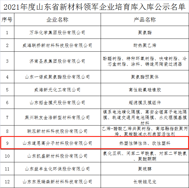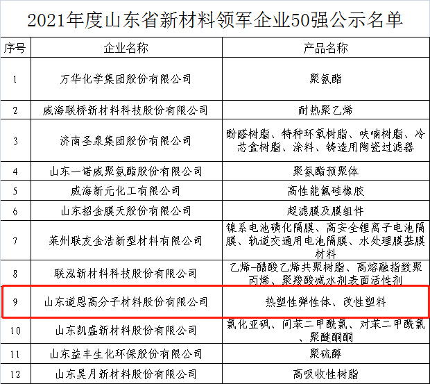 日前,2021年度山东省新材料领军企业培育库入库名单和2021年山东省新材料领军企业50强名单出炉。好博股份的热塑性弹性体、改性塑料入围上述榜单。