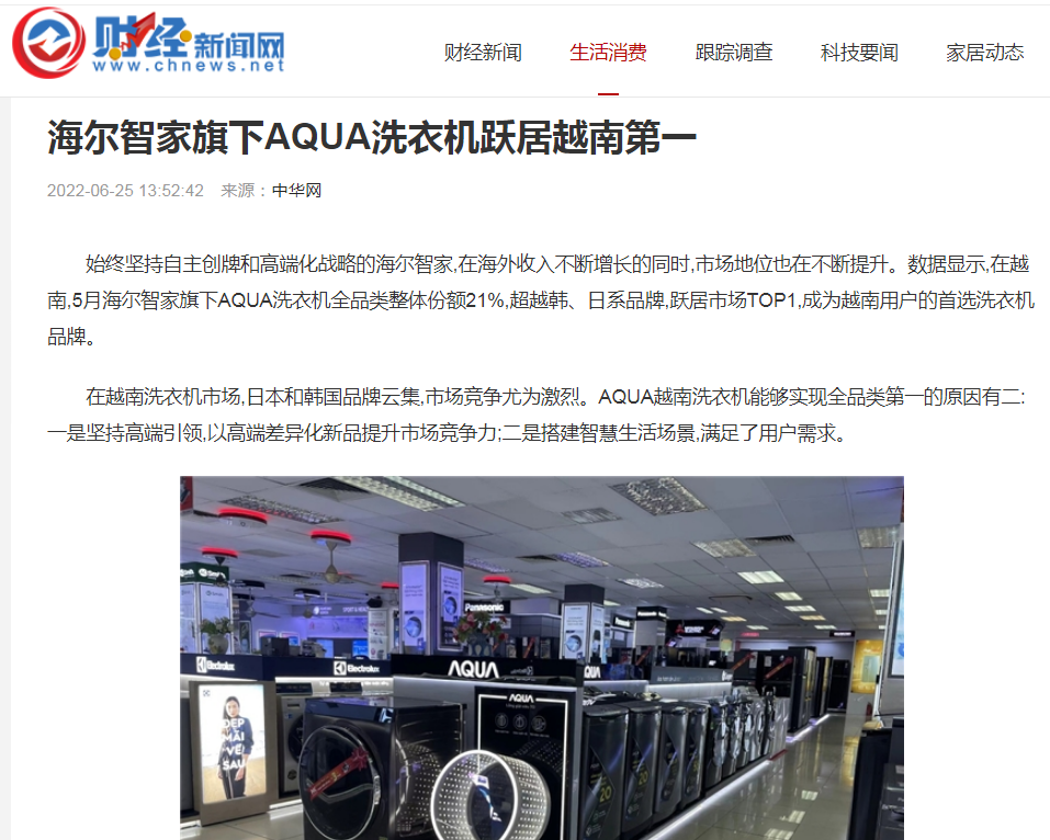 据了解,AQUA是海尔智家旗下高端品牌,始终坚持高端引领,以高端差异化新品提升市场竞争力,致力于搭建智慧生活场景,满足用户需求。该公司生产的洗衣机、冰箱产品在越南市场份额分别位居行业榜首。