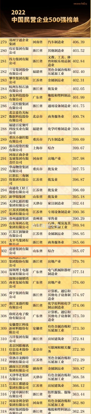 9月7日上午,全国工商联发布了2022中国民营企业500强榜单,集团公司凭借385.07亿元营收位列302位,较去年提升29个位次,再创历史新高,彰显了企业的综合实力和强劲的发展动力。
