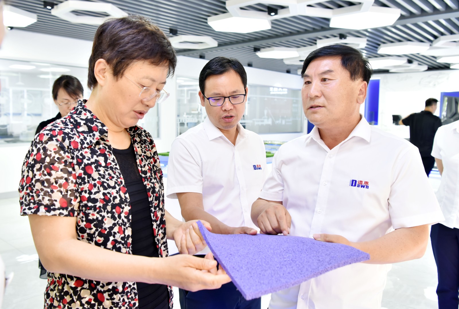走进好博股份一楼产品展厅,王随莲副主任听取了公司发展历程、产业布局、研发体系、产品应用等情况介绍。当得知好博高性能热塑性弹性体、氢化丁腈、聚丙烯熔喷专用料等核心产品,获得了多项“国字号”殊荣,并持续扩大国内外市场份额,王随莲副主任连声说,“很好,未来还会获得更多的荣誉”,她希望企业汇聚更多优质资源,为经济社会发展贡献智慧和力量。