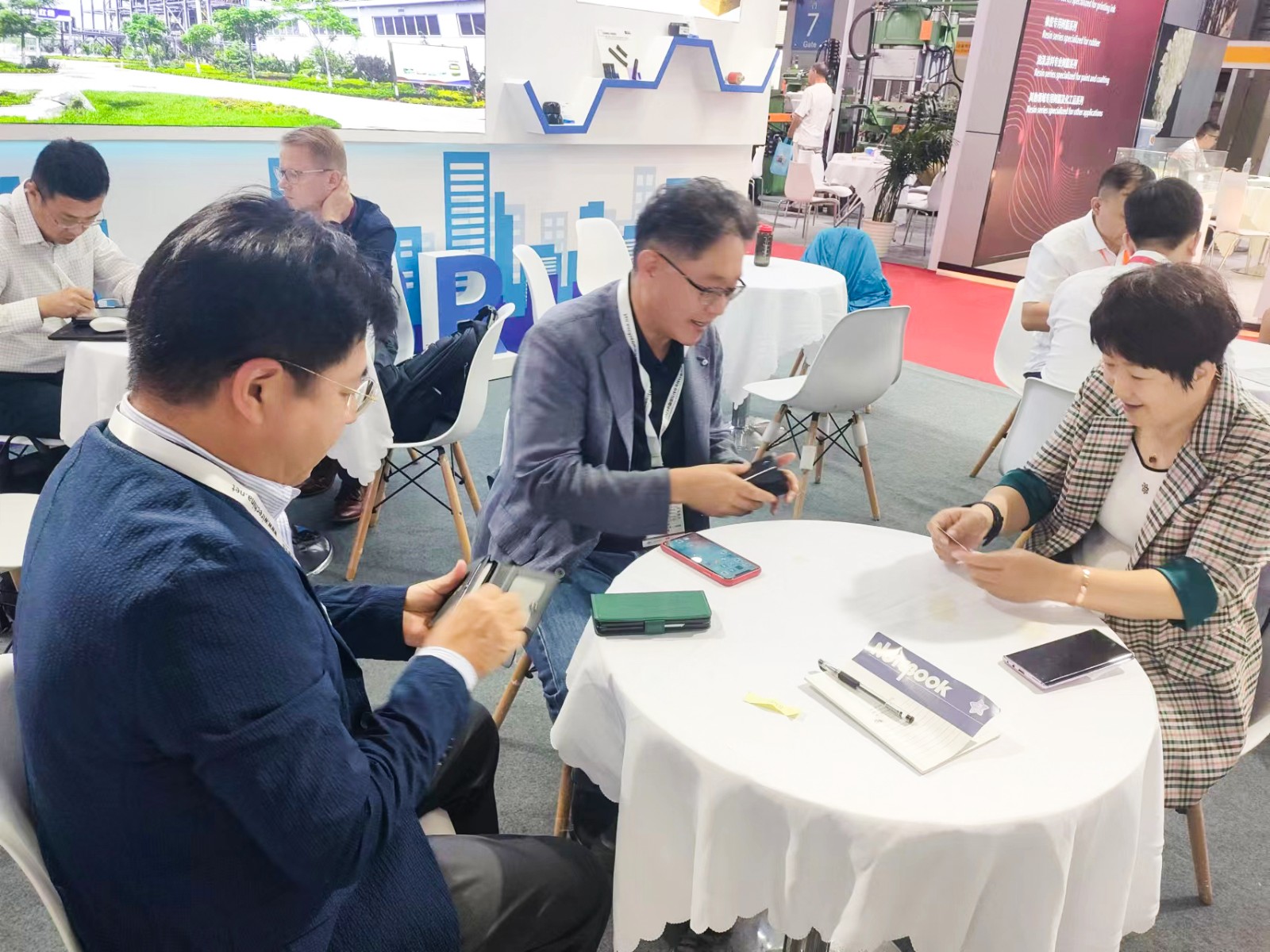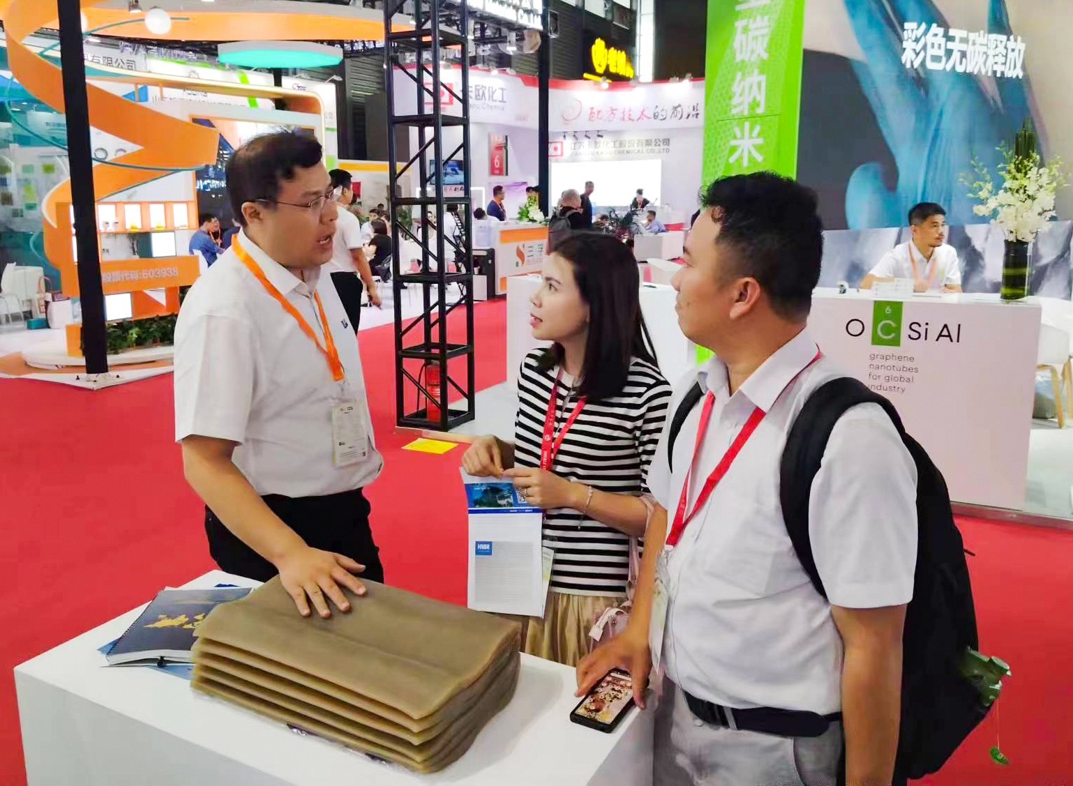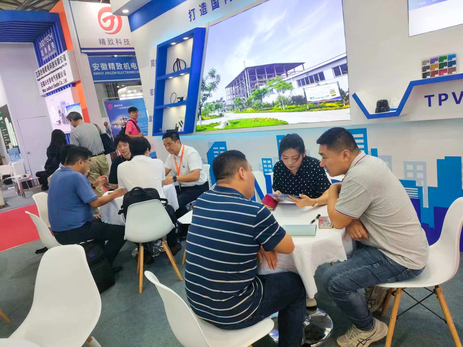 展会首日,岱高公司、哈金森、诺德曼等重点客户慕名来到好博展位洽谈交流,好博集团副总裁邱焕玲及好博股份、好博特弹公司有关领导与客户进行沟通互动,共同探讨后续合作情况。期间,韩国某客户与好博特弹公司达成战略合作意向,在现有合作的基础上,将于2024年开始用量翻倍。