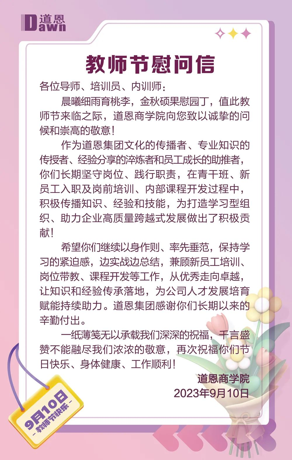 多年来,好博集团始终崇尚尊师重道,致力于支持教育事业发展的同时,在企业内部精心打造了好博商学院,构建了完善的培养体系,深入推行导师制,培养了高素质的内训师队伍。教师节前夕,好博商学院向广大导师、培训员和内训师致信表示慰问。