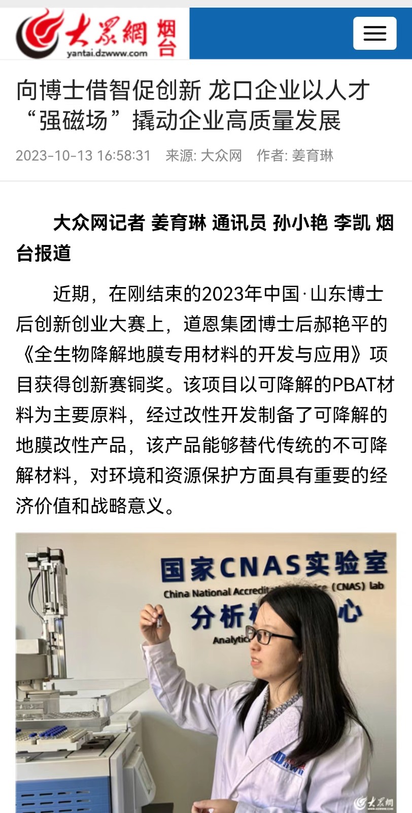 此前的9月18日,2023年中国·山东博士后创新创业大赛颁奖典礼在山东省青岛市举行。好博集团在站博士后郝艳平站上了领奖台,她主持的“全生物降解地膜专用材料的开发与应用”项目获得了创新赛铜奖。据悉,这是龙口市唯一获奖的博士后工作站项目。