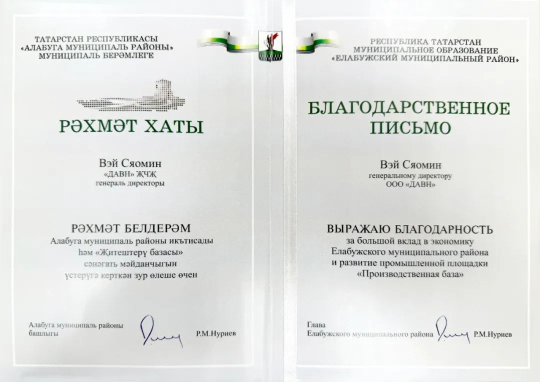“感谢贵公司为叶拉布加市及叶拉布加工业区的经济发展和进步作出了重大贡献。”10月24日,在鞑靼斯坦共和国叶拉布加市举行的年度经济发展交流会上,该市市长卢列夫·鲁斯塔姆为好博英德尔有限责任公司颁发的致谢信,如是评价好博在俄罗斯工厂突出的表现。